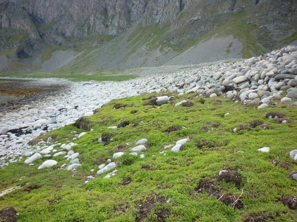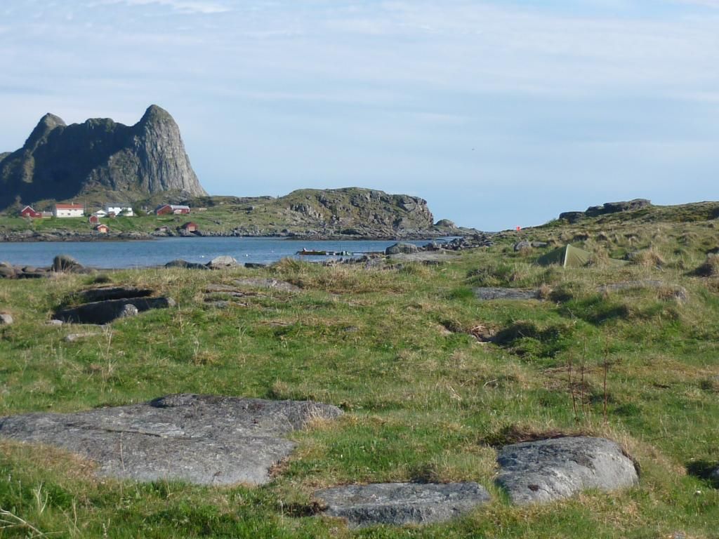 I get up at 3.30 am, take down the tent, and walk to the ferry. But it's in a big industrial wharf area and I wander around increasingly stressed out, trying to find it. I finally do, having to run flat-out in hiking boots and a backpack and getting to the entrance where the cars drive in, five minutes before the ferry leaves. Ow, my feet. /o\ Apparently you were supposed to go to a special waiting area for passengers? Oh yeah, where? The ferry ride is uneventful; I stock up on water and electrical charge for my cellphone and laptop and stuff. I get to Værøy and find a good spot for my tent on a small peninsula near the village (watch for the well-camouflaged tent):