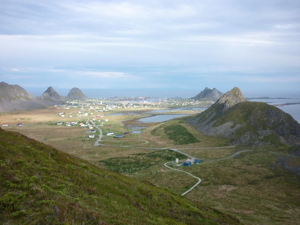 Anyway, I call a guy who organizes boat tours to the bird cliffs where there are nesting puffin birds and various other auks (it's not accessible by walking), but he says you should be four people at least to split the cost, or it's going to be really expensive. I hold off and hope other tourists come along. But unfortunately, it's not really the tourist season yet. I climb up a small mountain in the evening. This is the view of the Værøy village from there: