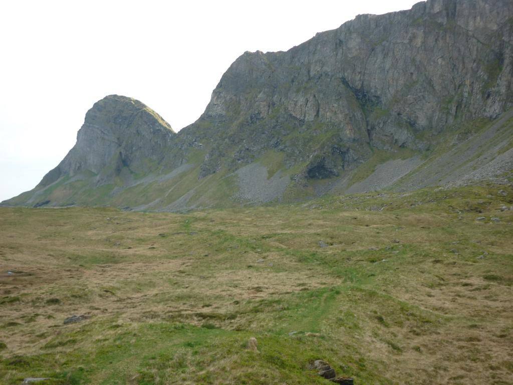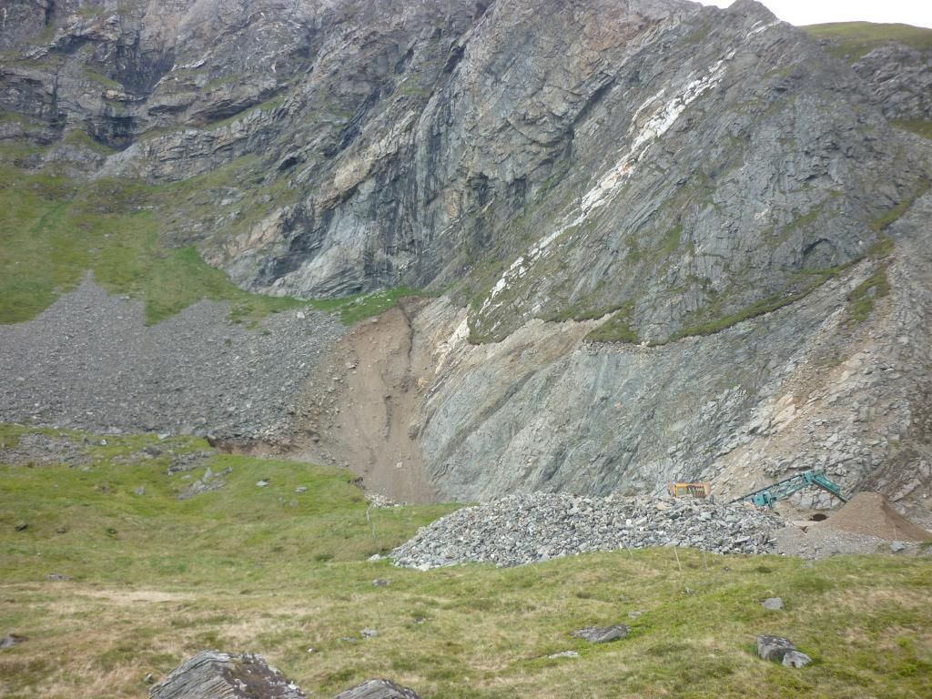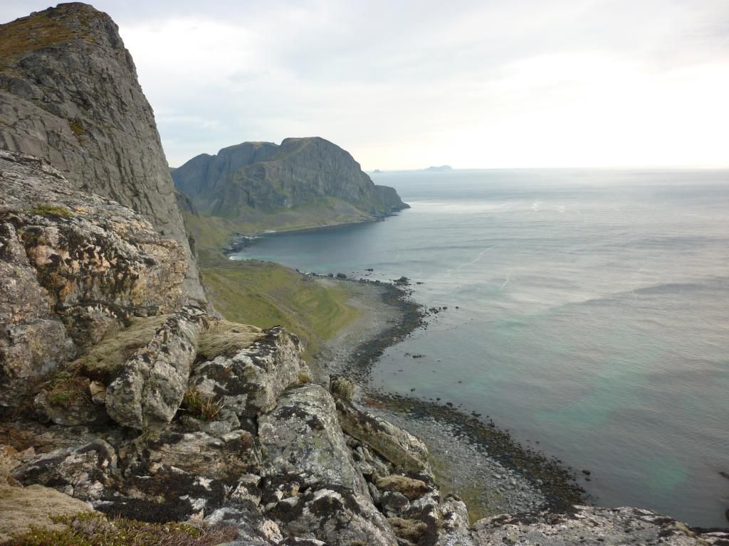 I really wonder though how this landscape was formed geologically: the really steep mountains and the flat plains at the foot. The flat plain even extends far out into the sea; you can see on the photos from the high viewpoint how shallow the water is. And here's a photo of the mountain with the talus scraped away for whatever reason--see how the mountain meets the flat plain almost at a right angle: